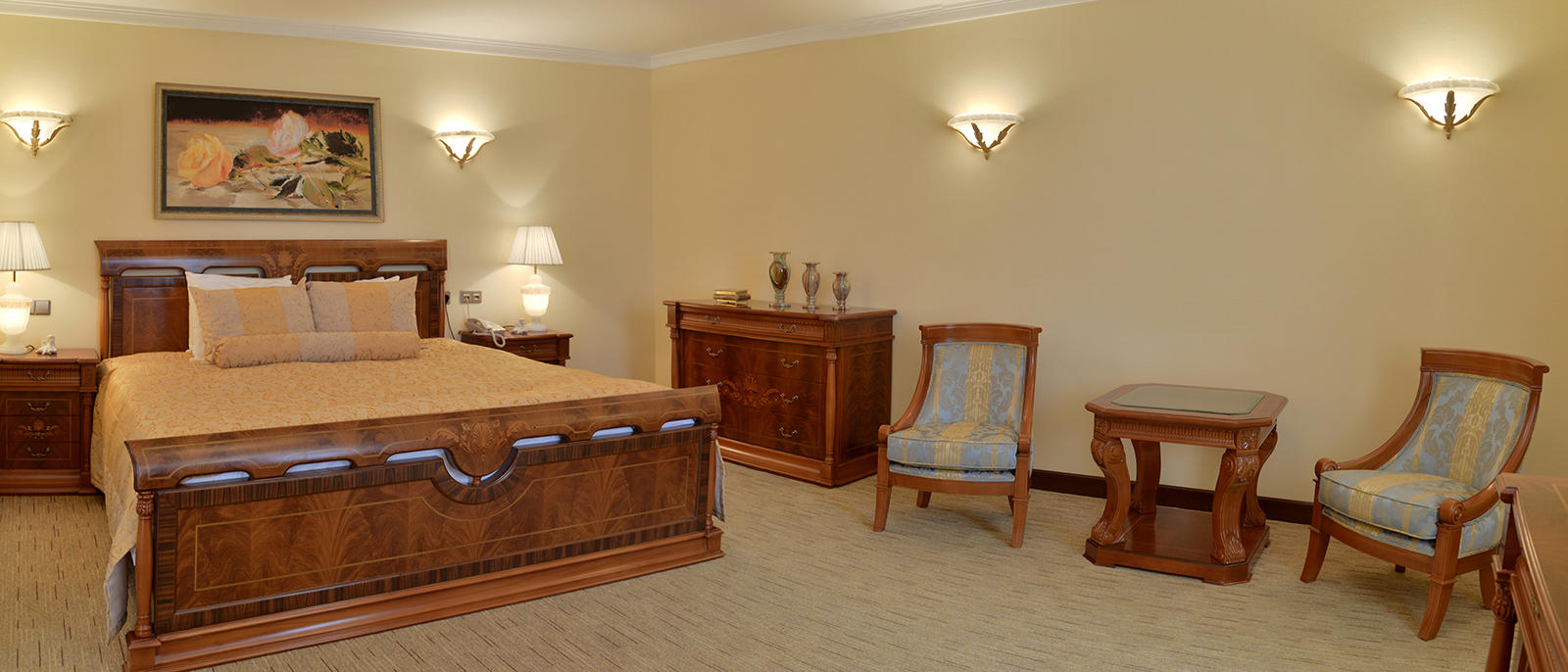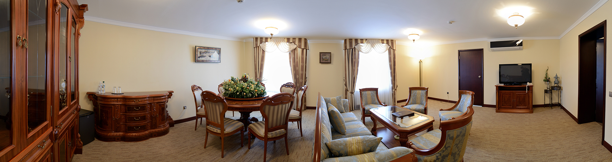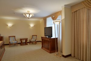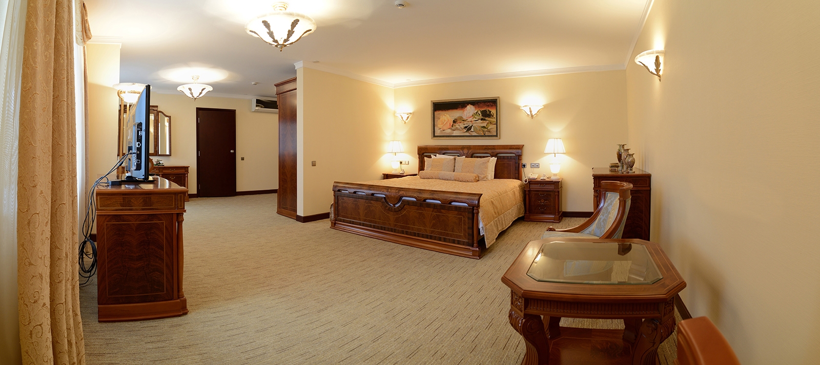 Эксклюзивный, единственный в отеле номер представительского класса с прекрасным видом на город. Состоит из спальни, гостевой спальни, столовой, кабинета, комнаты для переговоров с круглым столом. В номере – просторная ванная комната, с ванной-джакузи и душевой кабиной, гостевая спальня также оснащена отдельным санузлом. Интерьер выполнен в классическом стиле и в мягких пастельных тонах, что создает атмосферу покоя и комфорта. Номер оснащен всем необходимым, продумана каждая деталь – всё для комфортного проживания почетных гостей отеля.