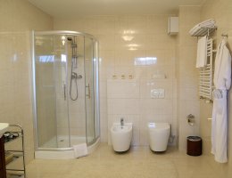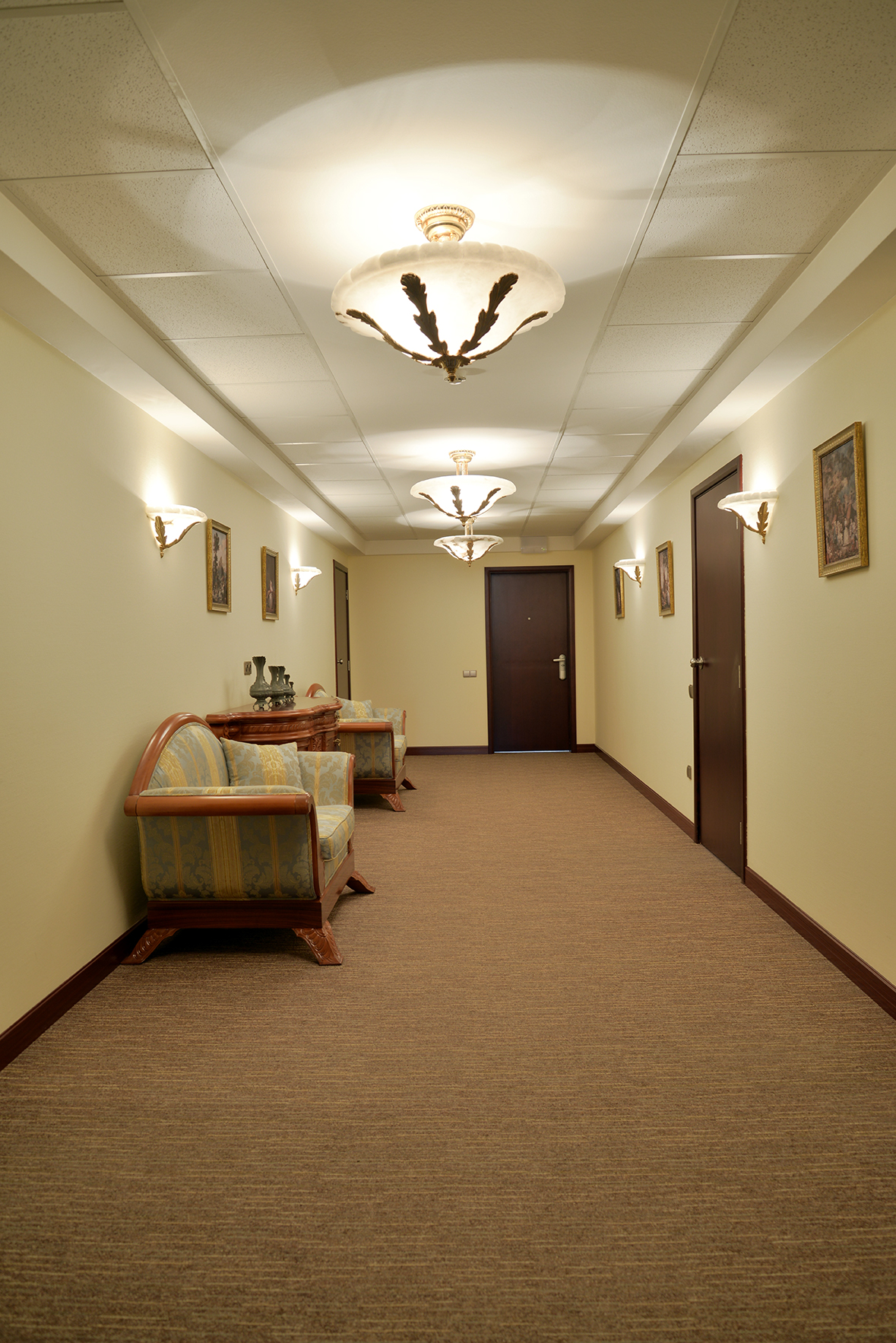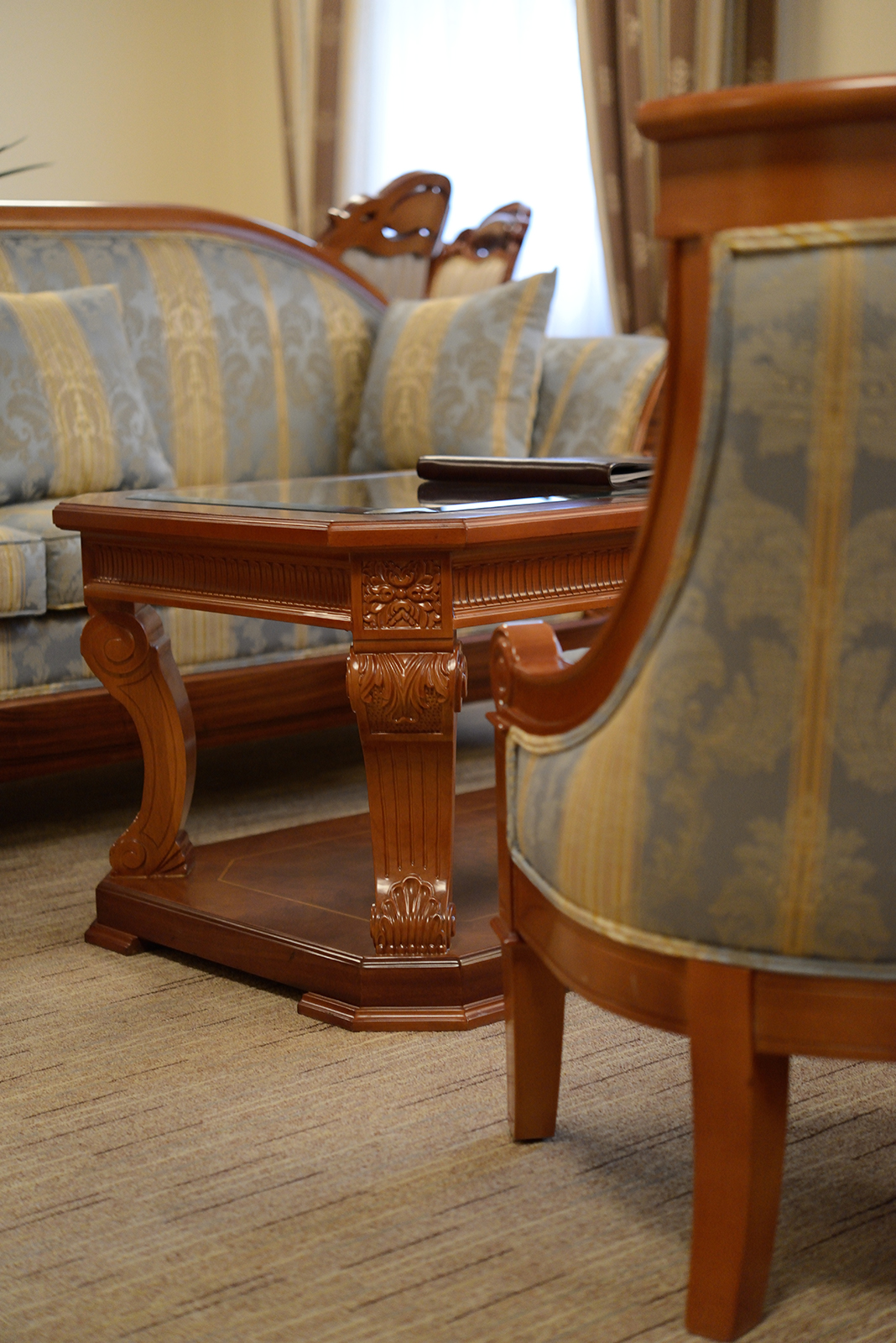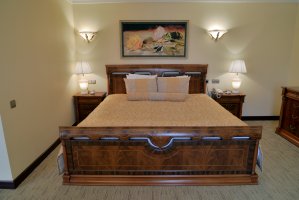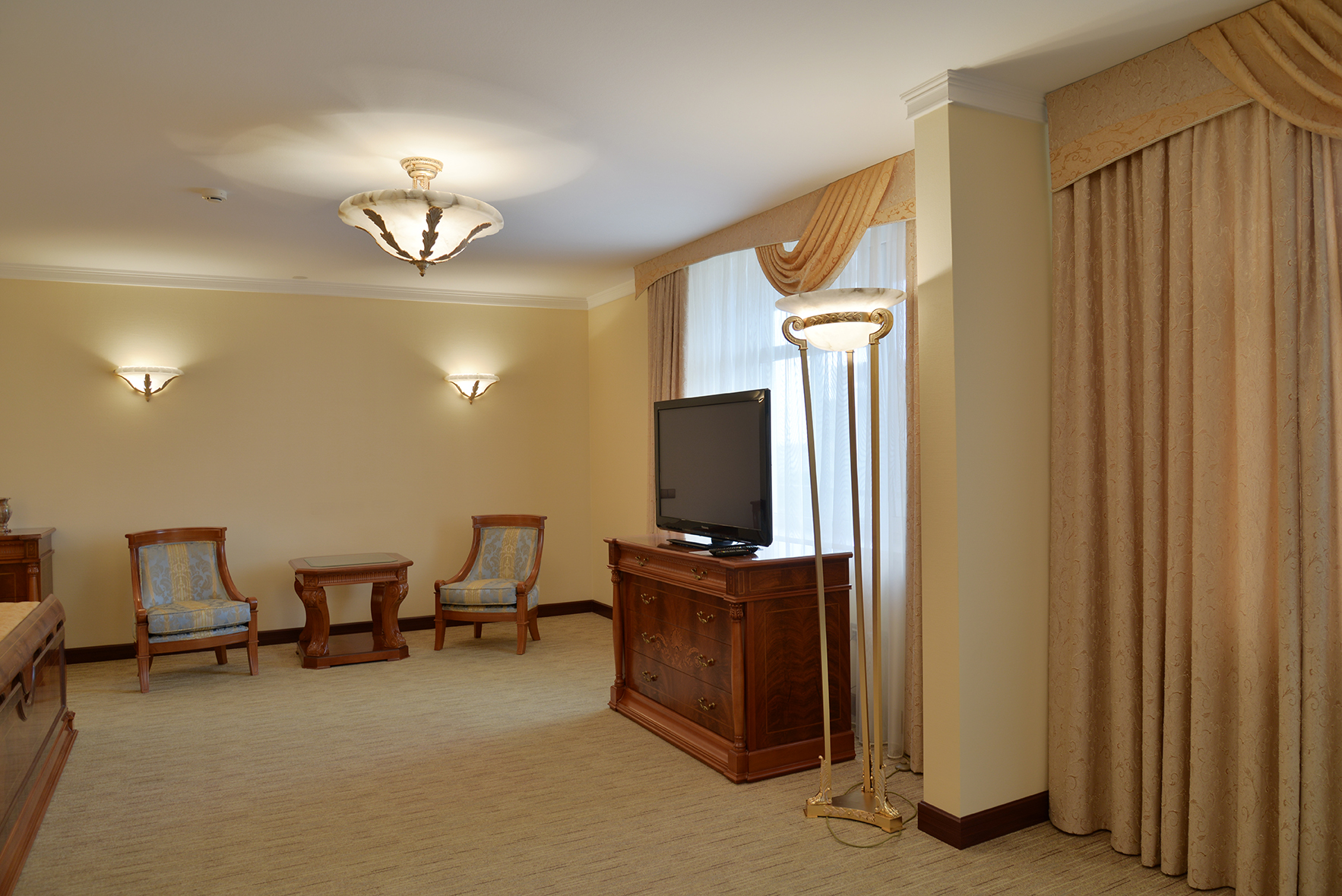 Эксклюзивный, единственный в отеле номер представительского класса с прекрасным видом на город. Состоит из спальни, гостевой спальни, столовой, кабинета, комнаты для переговоров с круглым столом. В номере – просторная ванная комната, с ванной-джакузи и душевой кабиной, гостевая спальня также оснащена отдельным санузлом. Интерьер выполнен в классическом стиле и в мягких пастельных тонах, что создает атмосферу покоя и комфорта. Номер оснащен всем необходимым, продумана каждая деталь – всё для комфортного проживания почетных гостей отеля.